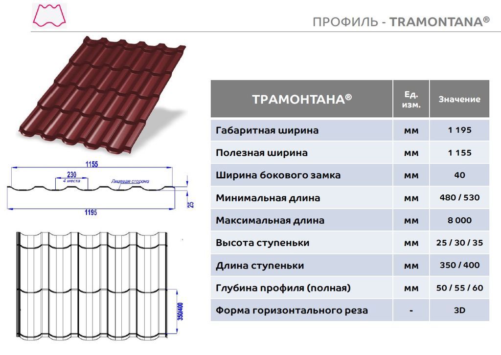 ТРАМОНТАНА — это новый профиль металлочерепицы. Если площадь скатов вашей крыши больше средней, данная стальная черепица будет оптимальным решением. Его глубина составляет 50, 55, 60 мм, длина ступеней — 350 и 400 мм. ТРАМОНТАНА привлекает внимание необычным внешним видом — узким гребнем и широким прогибом волны. Также она обладает повышенной жёсткостью, поэтому её рекомендуется использовать в районах, где крыша подвержена повышенным ветровым нагрузкам. Профиль ТРАМОНТАНА — оптимальное решение для прочной и необычной крыши!
