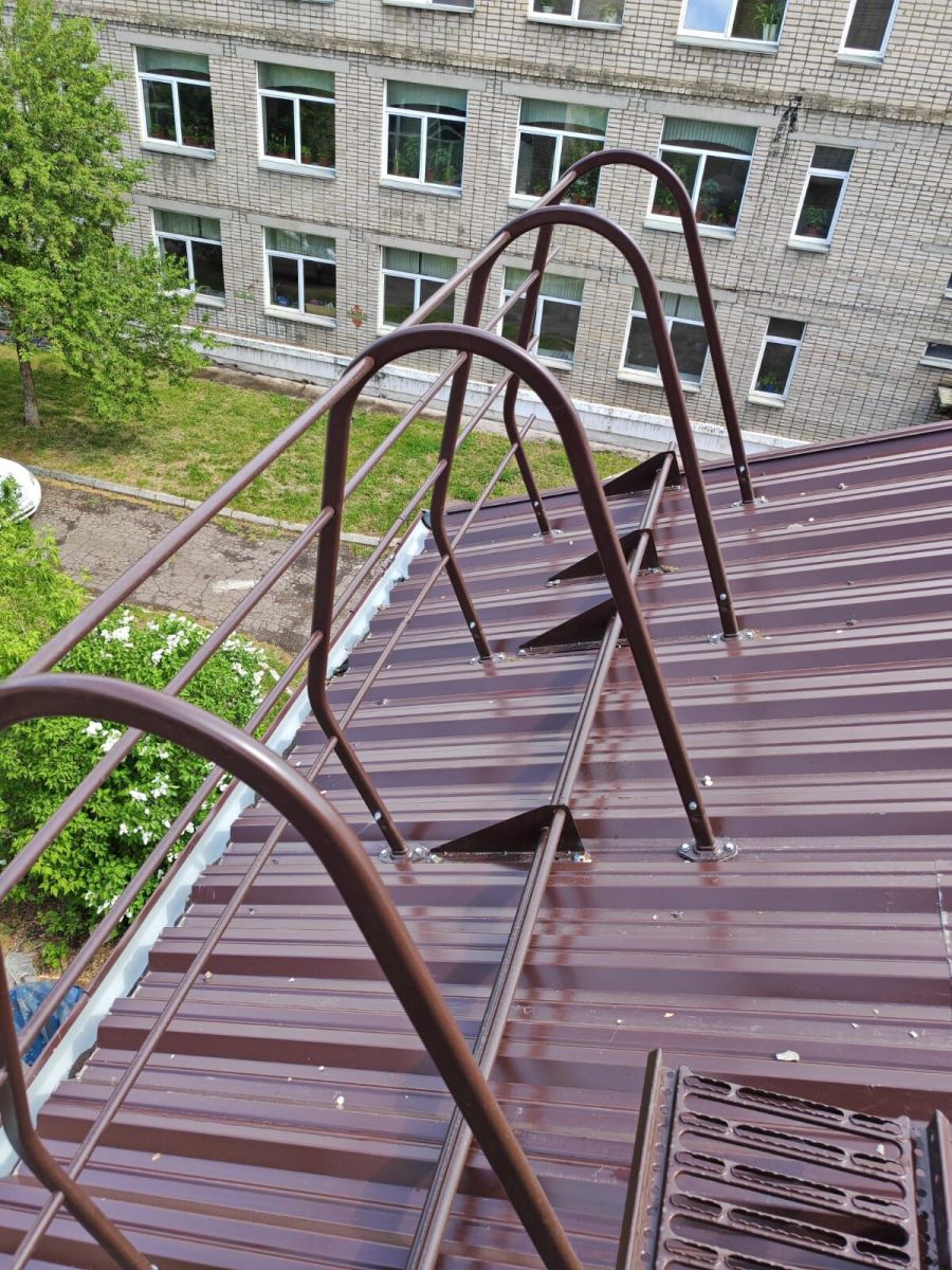 Предохраняет от падения с крыши во время проведения работ. Является обязательным элементом для многоэтажных зданий.