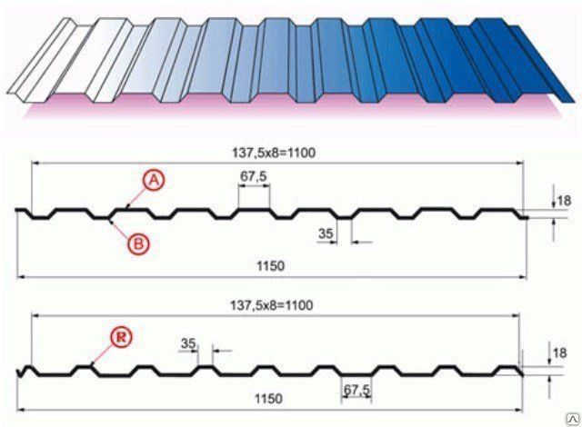 Профлист МП20 имеет трапецевидную форму, что придаёт жесткость листу. Профлист часто применяется в строительстве кровли, так как имеет на торцах листа защитную канавку, которая защищает от протечек.