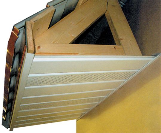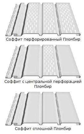 Виниловый Софит выпускается в трех типах: сплошной (чаще всего используется для подшивки потолков веранд и навесов), перфорированный и с перфорацией на центральной полосе (чаще всего используется для подшивки карнизных свесов и перфорация служит для беспрепятственного входа воздуха в вентиляционный зазор кровли, тем самым обеспечивая условия для вентиляции кровельной конструкции.)