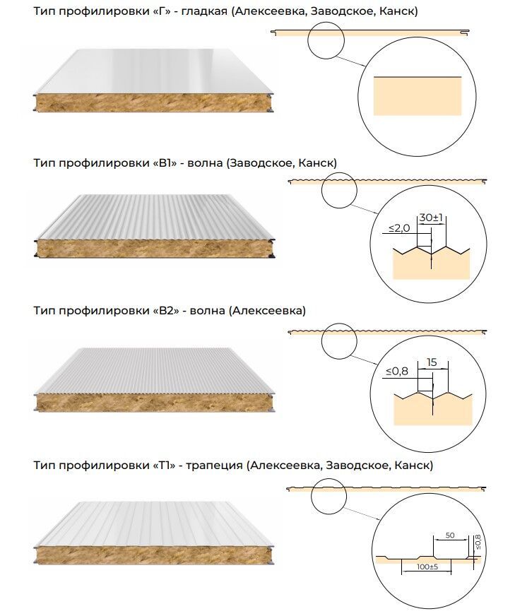 Панели состоят из двух металлических листов и сердечника из минеральной ваты между ними. Обкладки прочно соединяются с утеплителем благодаря двухкомпонентному полиуретановому клею. Минеральная вата – волокнистый теплоизоляционный материал на синтетическом связующем, его изготавливают из базальтового сырья расплавов горных пород.